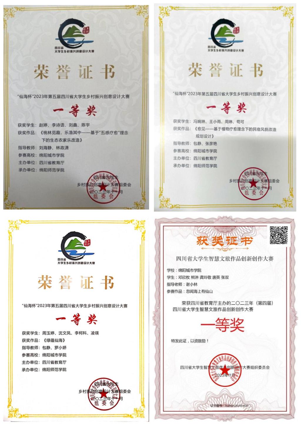 城乡规划专业连续5年组织员工参加“四川省乡村振兴创意设计大赛”“四川省智慧文旅作品创新创作大赛”获得奖项累计超过150项,参赛员工达到400余人次,员工发表相关论文100余篇,参加省级创新创业项目50余项。