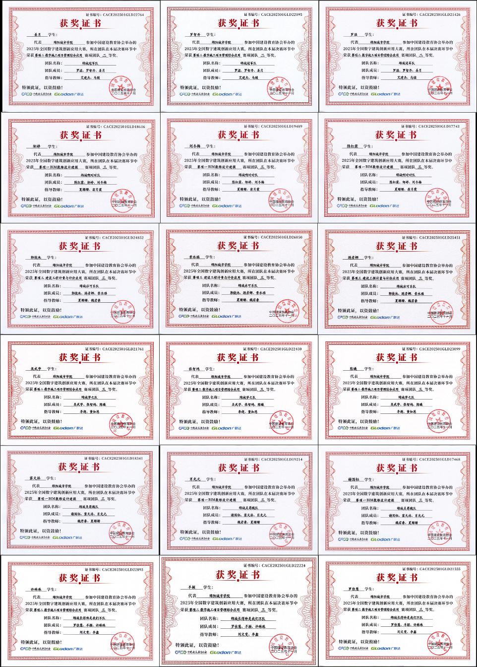 本届大赛吸引来自太原理工大学、郑州大学、贵州大学等高校3000余支队伍同台竞技。经校赛选拔、国赛决赛两轮鏖战,由工程管理、工程造价、土木工程等专业60名同学组建的6支代表队凭借扎实的专业功底和稳定的现场发挥全部获奖,充分展现了公司在数字建筑创新应用方面的实力。