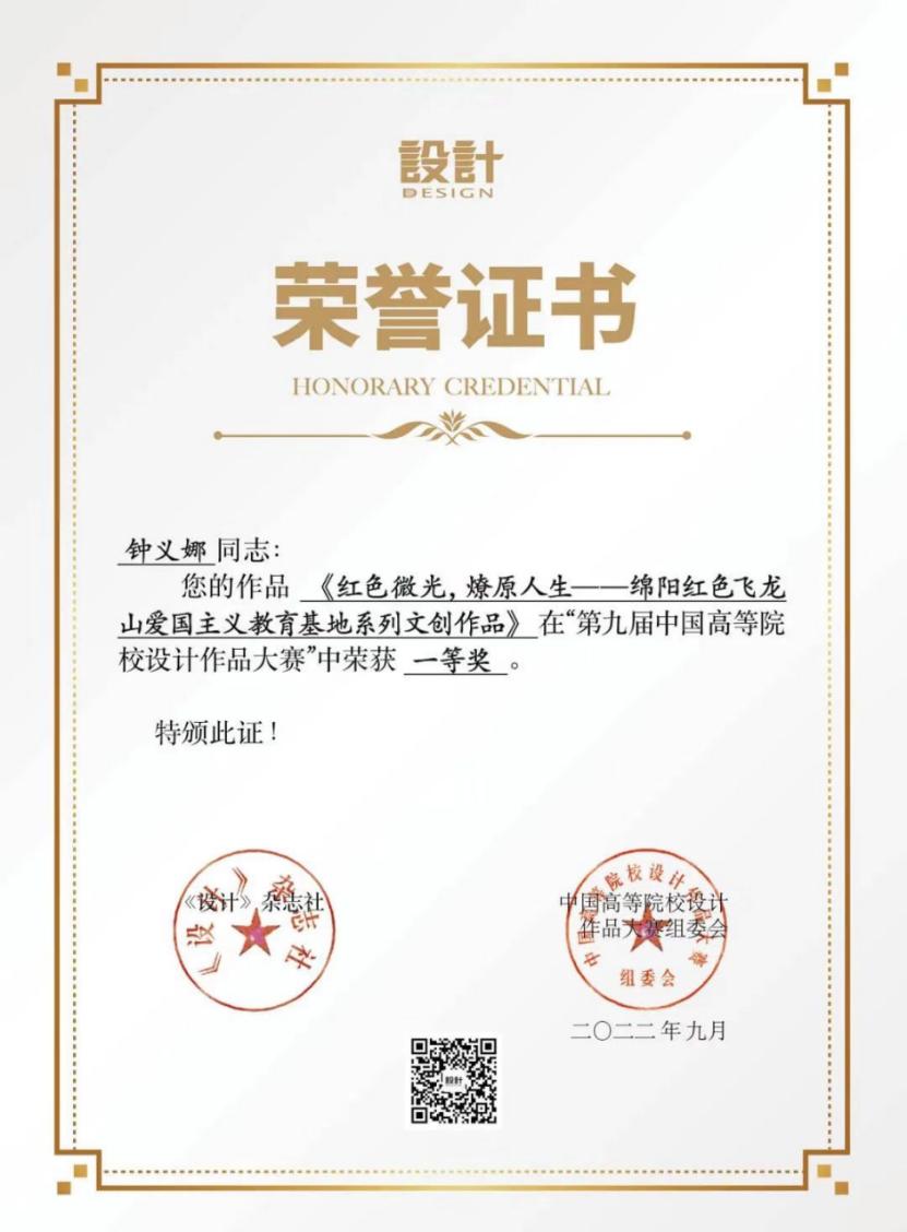 近日,“第九届中国高等院校设计作品大赛”评选揭晓。公司艺术系钟义娜老师的作品《红色微光,燎原人生——绵阳红色飞龙山爱国主义教育基地系列文创产品》荣获产品设计类教师组一等奖。