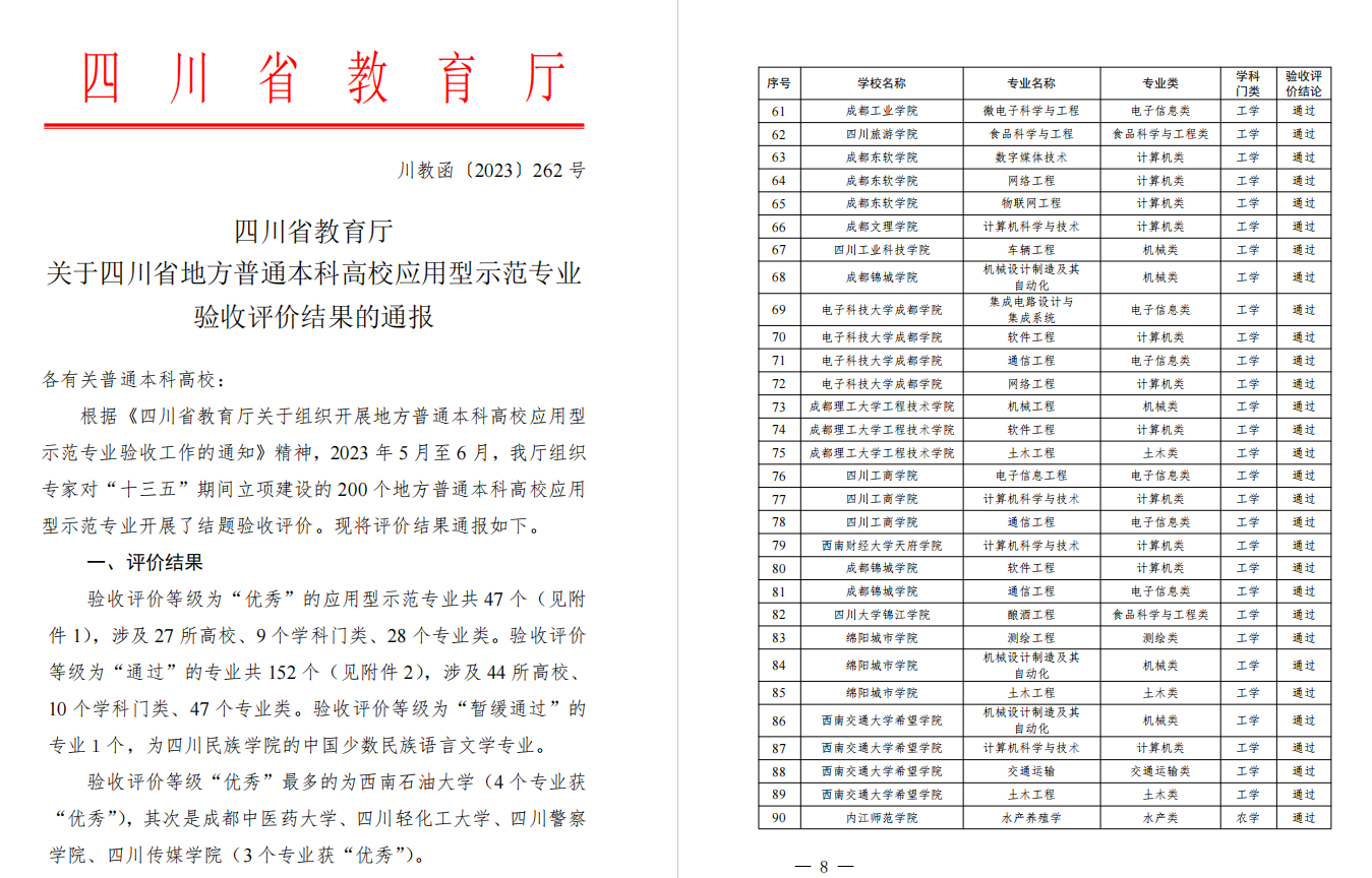 7月26日,四川省教育厅发文《四川省教育厅关于四川省地方普通本科高校应用型示范专业验收评价结果的通报》(川教函〔2023〕262 号)。永利yl23411集团官网入口现代技术公司土木工程、测绘工程、机械制造及其自动化3个专业全部顺利通过验收。
