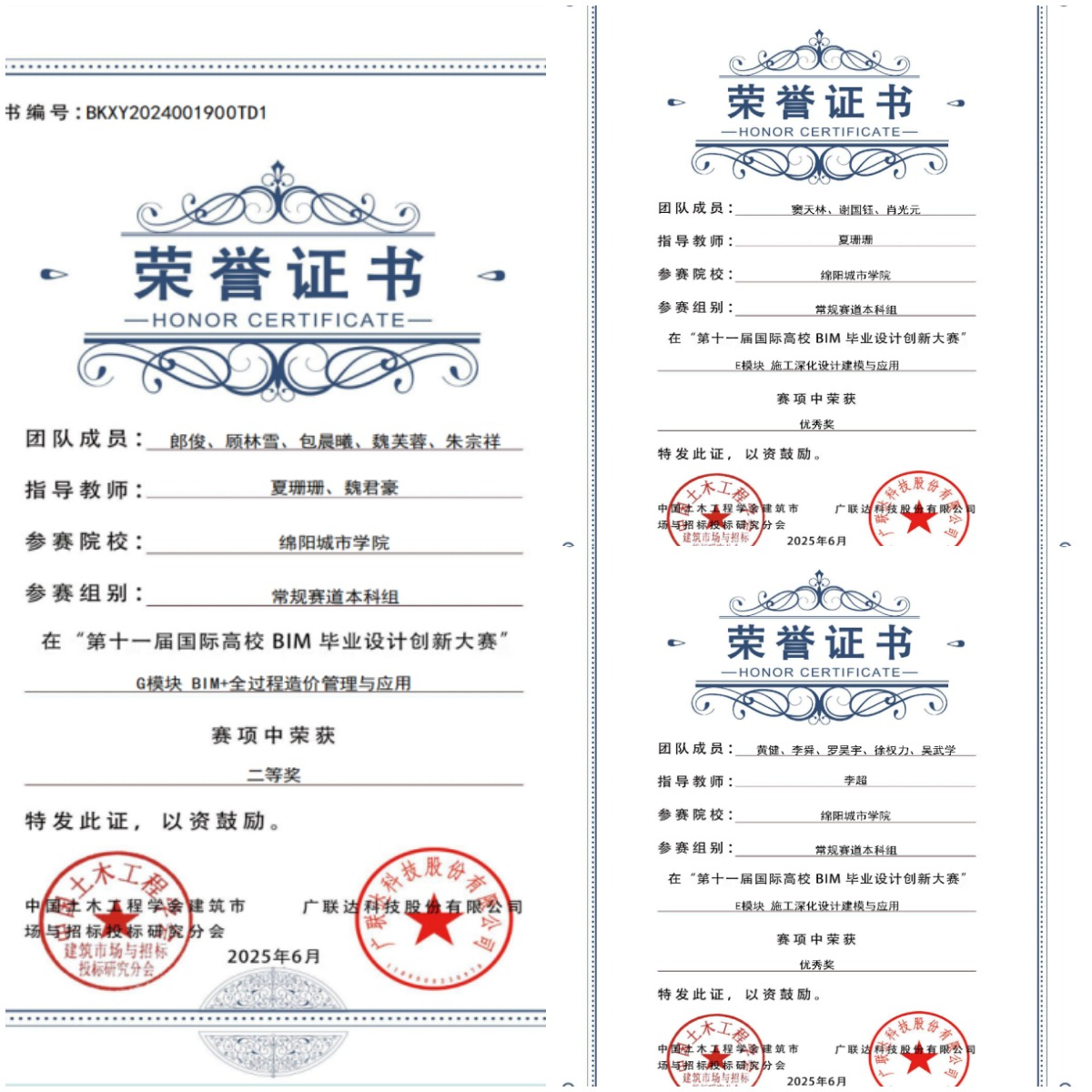 第十一届国际高校BIM毕业设计大赛吸引全球700余所院校、1.4万余支团队、8万余名师生参与,累计提交作品4400余份。公司选派五支团队参赛,历经8个月精心备战,从激烈竞争中脱颖而出,成功进军全国总决赛,最终以扎实的BIM技术功底和卓越的团队协作能力,斩获全国二等奖1项、优秀奖2项。