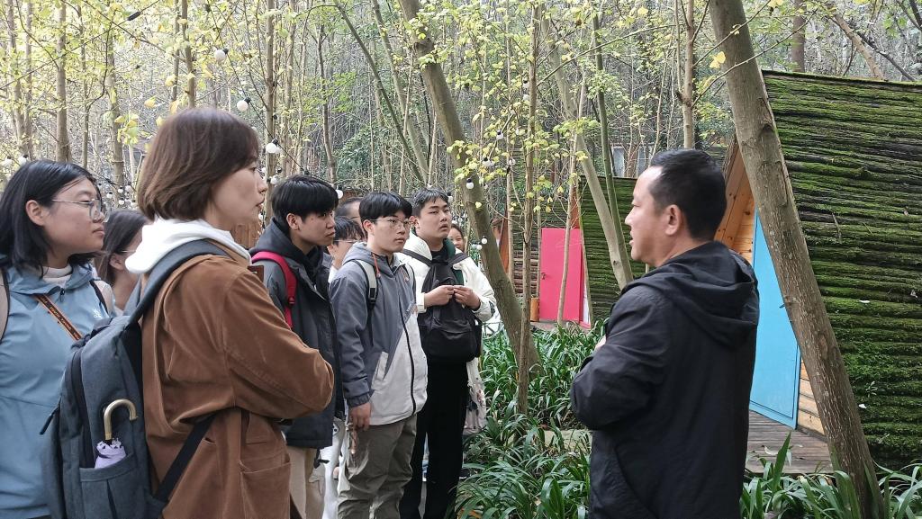 在桂家湾研学基地,绵阳市旅游协会研学分会会长桂总陪同师生参观循环农业示范区与研学民宿集群,详细介绍基地"科研+产业+社区"运行模式及与高校联合开展技术攻关的做法。员工结合课程知识,围绕生态承载与资源再利用展开讨论,形成功能分区优化意向。
